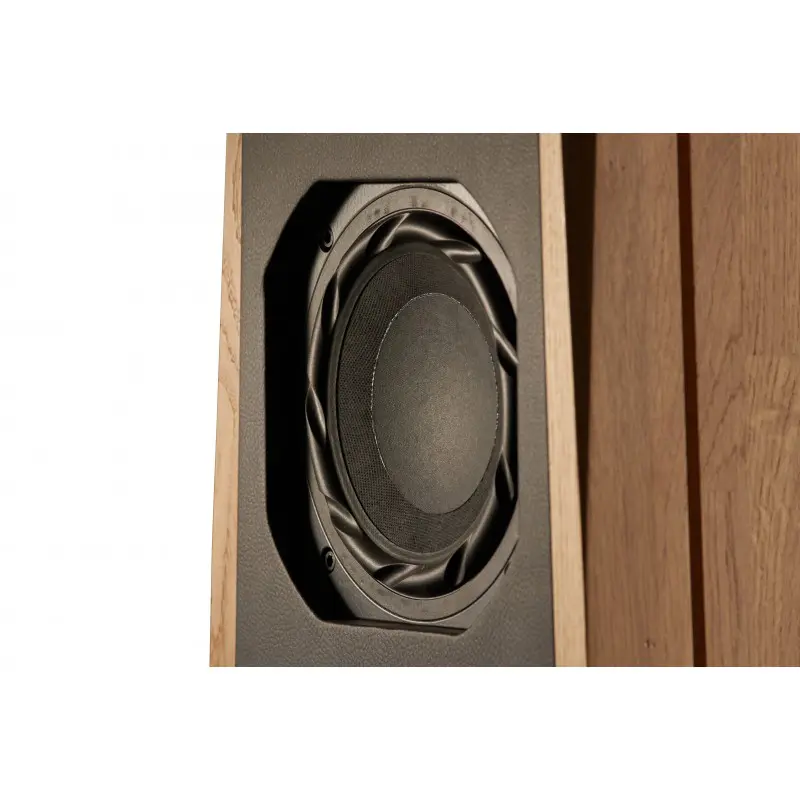 Le haut-parleur de 16 cm est complété par un deuxième haut-parleur de 13 cm placé en face arrière afin de Booster sa partie grave de cette 7db tout en annulant une grande partie des ondes stationnaires à l’intérieur du coffret. Son filtrage du troisième ordre décalé coupe les fréquences au-delà de 4 khz tout en redressant la phase pour un bon raccord avec le tweeter.