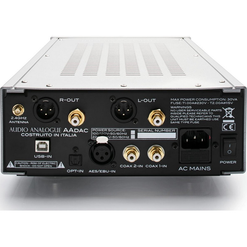 Convertisseur D/A hautes performances jusqu’à 32bits/768khz avec Sabre ES9038. Convertisseur USB Amanero jusqu’à 32bit/384KHz. DSD natif jusqu’à 512. 7 filtres numériques différents. Entrées numériques SPDIF, Toslink, AES/EBU. Entrée audio sans fil Bluetooth aptX® de haute qualité. Conseils séparés pour chaque étape. Alimentations séparées dédiées aux sections numérique et analogique. Étage de sortie entièrement symétrique et avec des composants audiograde discrets à parfaitement supporte les platines numériques à très faible bruit et à très faible distorsion. Sortie casque de haute qualité. Possibilité d’utilisation en mode direct (DAC) ou régulé en volume (DAC + préampli). Les pilotes pour utiliser AAdac connectés à des ordinateurs avec le système d’exploitation Windows peuvent être téléchargés à partir du lien suivant: http://amanero.com/drivers.htm Aucun pilote n’est requis pour les ordinateurs MAC.