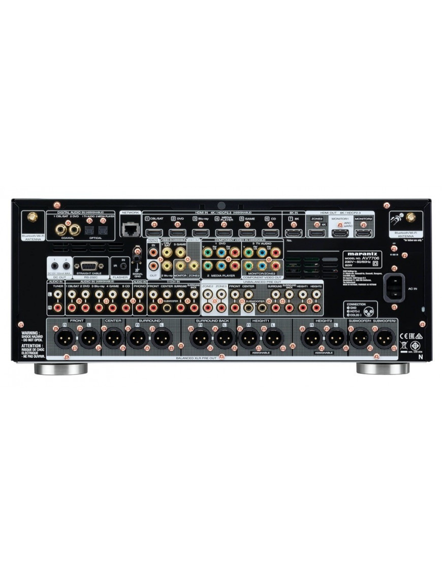 Le préamplificateur home-cinéma Marantz AV-7706 est un modèle 11.2 canaux compatible avec les derniers formats audio multicanaux comme le Dolby Atmos, DTS:X et Auro-3D pour un son immersif d’exception. Il succède au pré-ampli Marantz AV-7705 auquel il apporte un port HDMI 2.1 pour la prise en charge des contenus UHD 8K, ce qui en fait le compagnon indispensable d’une TV UHD 8K. Très complet, le pré-ampli home-cinéma Marantz AV-7706 est compatible avec la technologie Heos, les assistants vocaux Amazon Alexa, Google Assistant et Siri, ainsi qu’avec les systèmes multiroom Apple AirPlay 2 pour facilement diffuser de la musique ou des vidéos depuis un iPhone, un iPad, un Mac ou une Apple TV.
